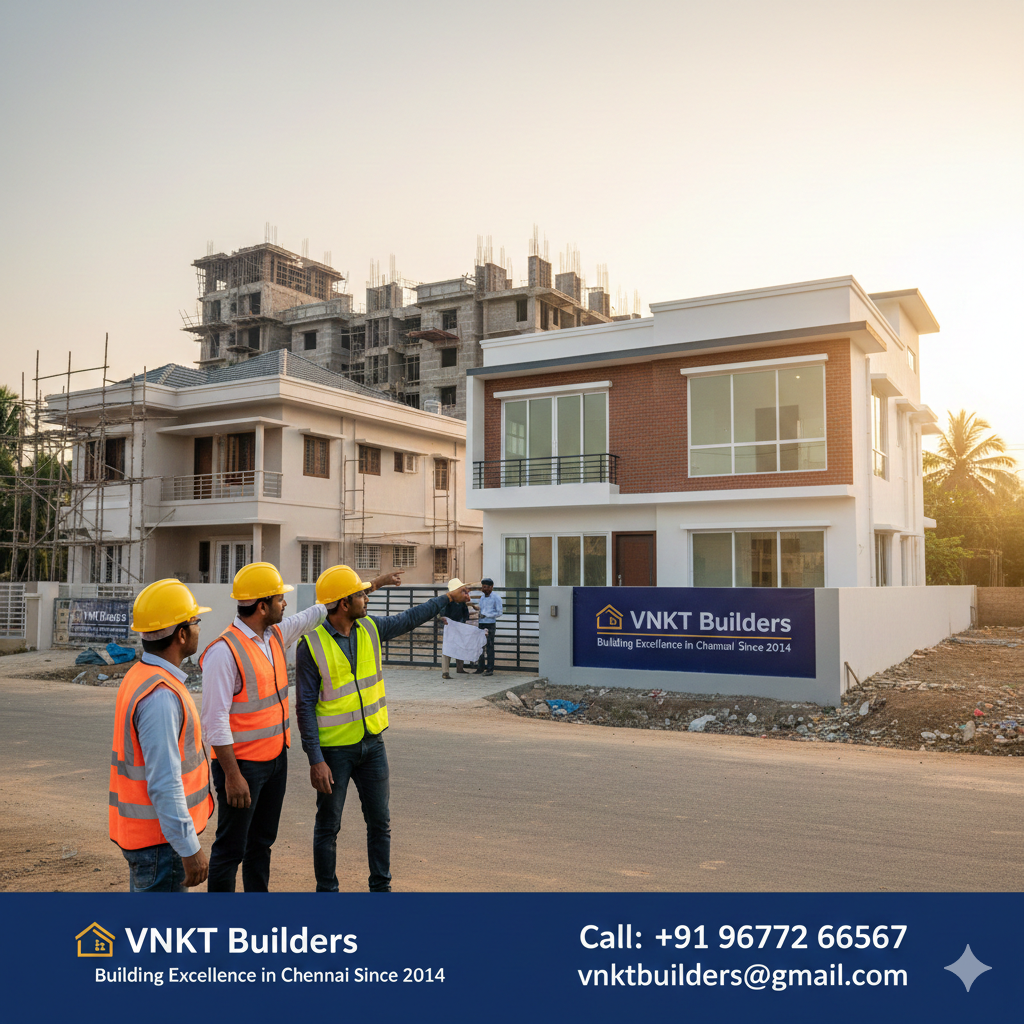 With over 11 years of expertise, VNKT Builders is a leading name in residential, commercial, and industrial construction across Chennai. Based in Pallikaranai, we specialize in turning blueprints into high-quality, sustainable structures.
